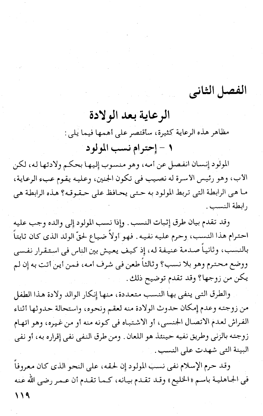 احترام هذا النسب، وحرم عليه نفيه. فهو أولا ضياع لحق الولد الذى كان ثابتا