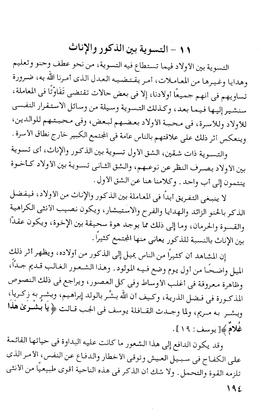 لا ينبغى التفريق أبدا فى المعاملة بين الذكور والإناث من الأولاد، فيفضل