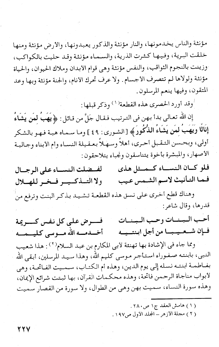 مؤنثة والناس يخدمونها، والنار مؤنثة والذكور يعبدونها، والا رض مؤنثة ومنها