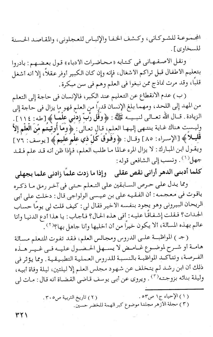 (ب) عدم الانقطاع عن التعليم عند الكبر، فالإنسان فى حاجة إلى التعلم