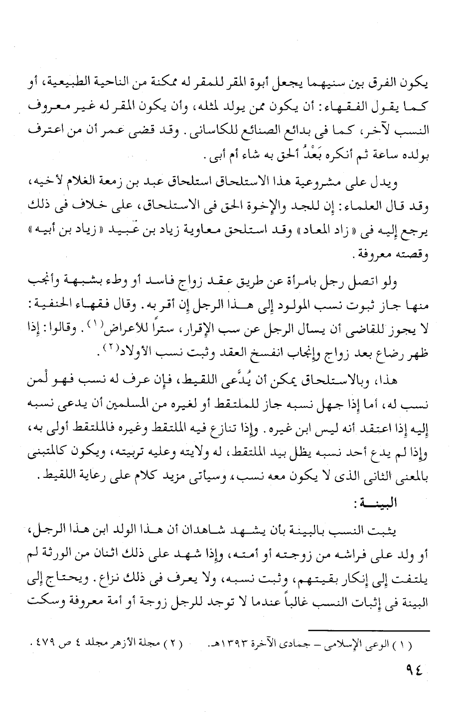البينه فى إثبات النسب غالبا عندما لا توجد للرجل زوجة أو أمة معروفة وسكت