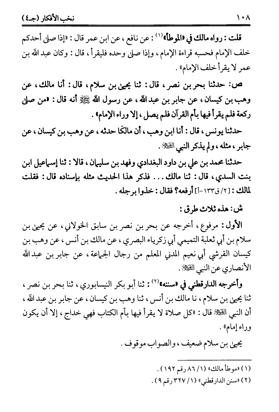 وأخرجه الدارقطني في "سننه" (¬2): ثنا أبو بكر النيسابوري، ثنا بحر بن نصر، ثنا يحيى بن سلام، نا مالك بن أنس، ثنا وهب بن كيسان، عن جابر بن عبد الله، أن النبي - عليه السلام - قال: "كل صلاة لا يقرأ فيها بأم الكتاب فهي خداج، إلا أن يكون وراء إمام".