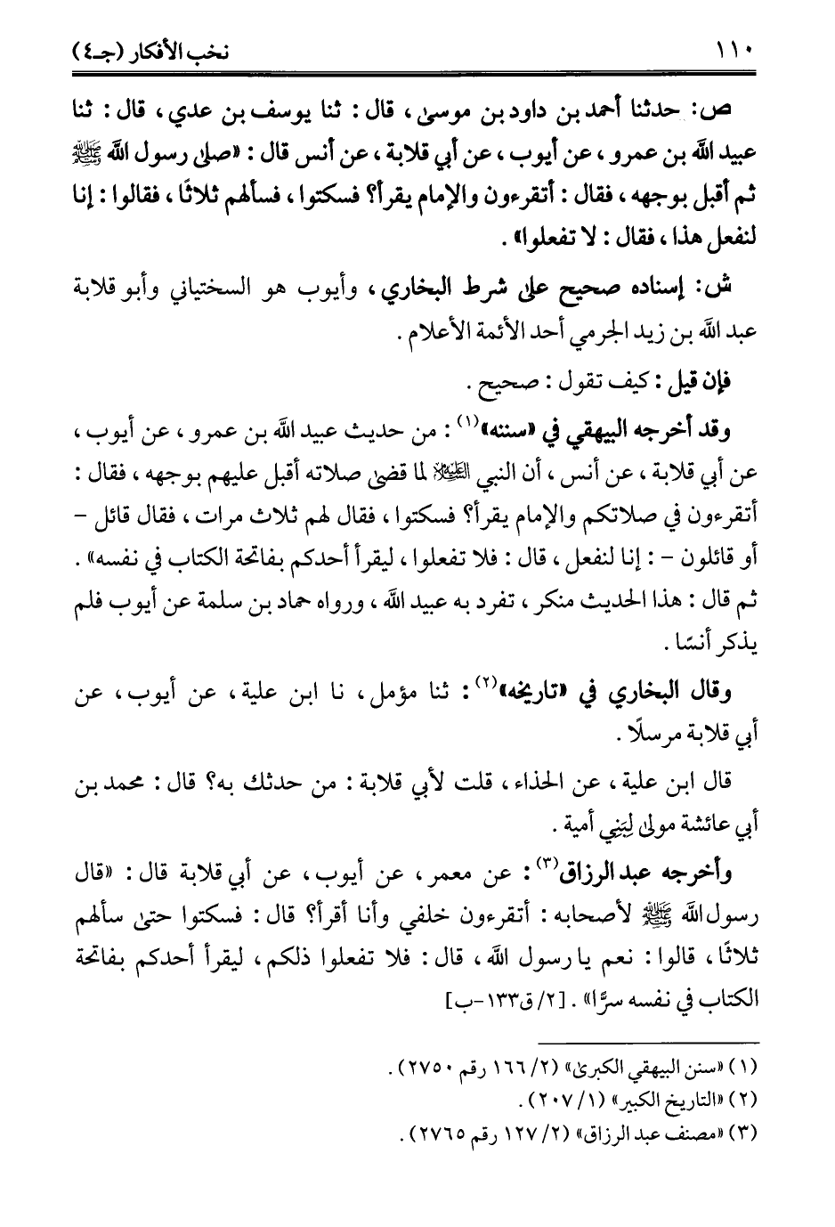 وأخرجه عبد الرزاق (¬3): عن معمر، عن أيوب، عن أبي قلابة قال: "قال رسول الله - صلى الله عليه وسلم - لأصحابه: أتقرءون خلفي وأنا أقرأ؟ قال: فسكتوا حتى سألهم ثلاثًا، قالوا: نعم يا رسول الله، قال: فلا تفعلوا ذلكم، ليقرأ أحدكم بفاتحة الكتاب في نفسه سرًّا".