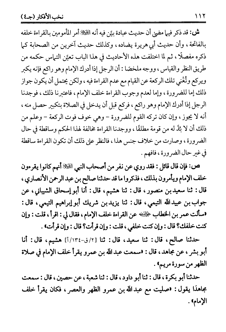 ص: فإن قال قائل: فقد روي عن نفر من أصحاب النبي - عليه السلام - أنهم كانوا يقرءون خلف الإِمام ويأمرون بذلك، فذكروا ما قد حدثنا صالح بن عبد الرحمن الأنصاري، قال: ثنا سعيد بن منصور، قال: ثنا هشيم، قال: أنا أبو إسحاق الشيباني، عن جواب بن عبيد الله التيمي، قال: ثنا يزيد بن شريك أبو إبراهيم التيمي، قال: "سألت عمر بن الخطاب - رضي الله عنه - عن القراءة خلف الإِمام، فقال لي: اقرأ، قلت: وإن كنت خلفك؟ قال: وإن كنت خلفي، قلت: وإن قرأت؟ قال: وإن قرأت".