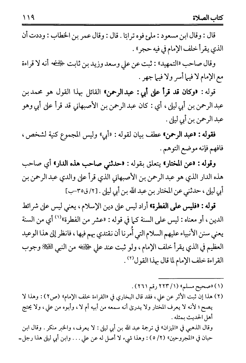 (¬2) هذا إن ثبت الأثر عن علي، فقد قال البخاري في "القراءة خلف الإِمام" (ص2): وهذا لا يصح؛ لأنه لا يعرف المختار ولا يدرى أنه سمعه من أبيه أم لا، وأبوه من علي، ولا يحتج أهل الحديث بمثله.