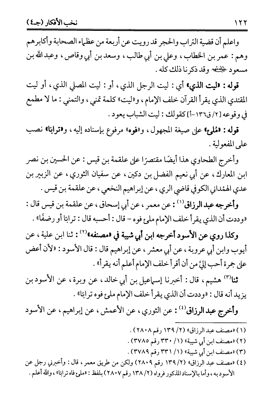واعلم أن قضية التراب والحجر قد رويت عن أربعة من عظماء الصحابة وأكابرهم وهم: عمر بن الخطاب، وعلي بن أبي طالب، وسعد بن أبي وقاص، وعبد الله بن مسعود - رضي الله عنهم - وقد ذكرنا ذلك كله.