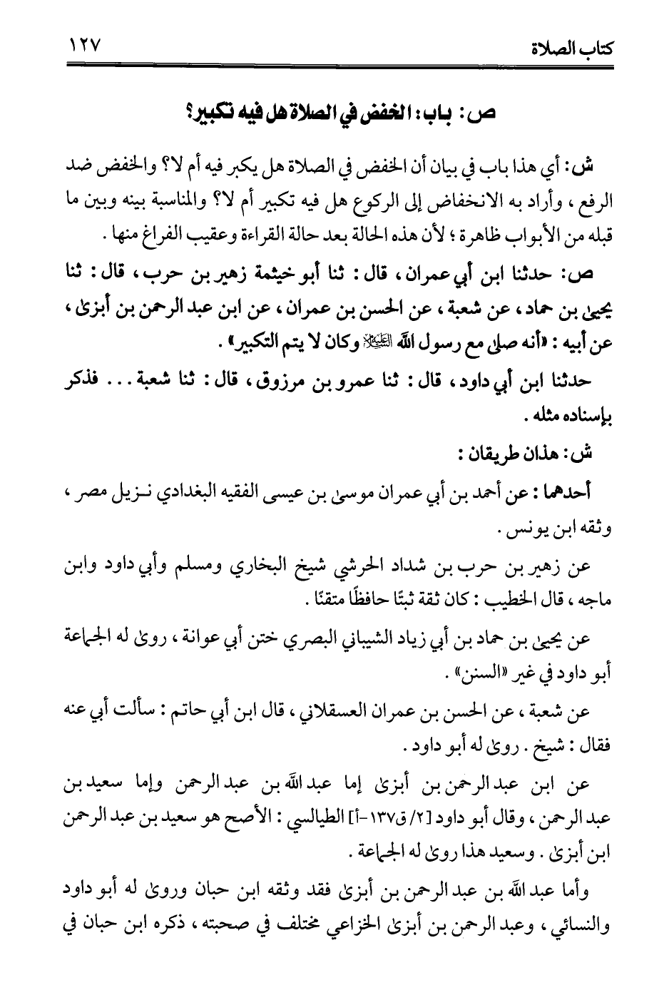 ص: حدثنا ابن أبي عمران، قال: ثنا أبو خيثمة زهير بن حرب، قال: ثنا يحيى بن حماد، عن شعبة، عن الحسن بن عمران، عن ابن عبد الرحمن بن أبزى، عن أبيه: "أنه صلى مع رسول الله - عليه السلام - وكان لا يتم التكبير".
