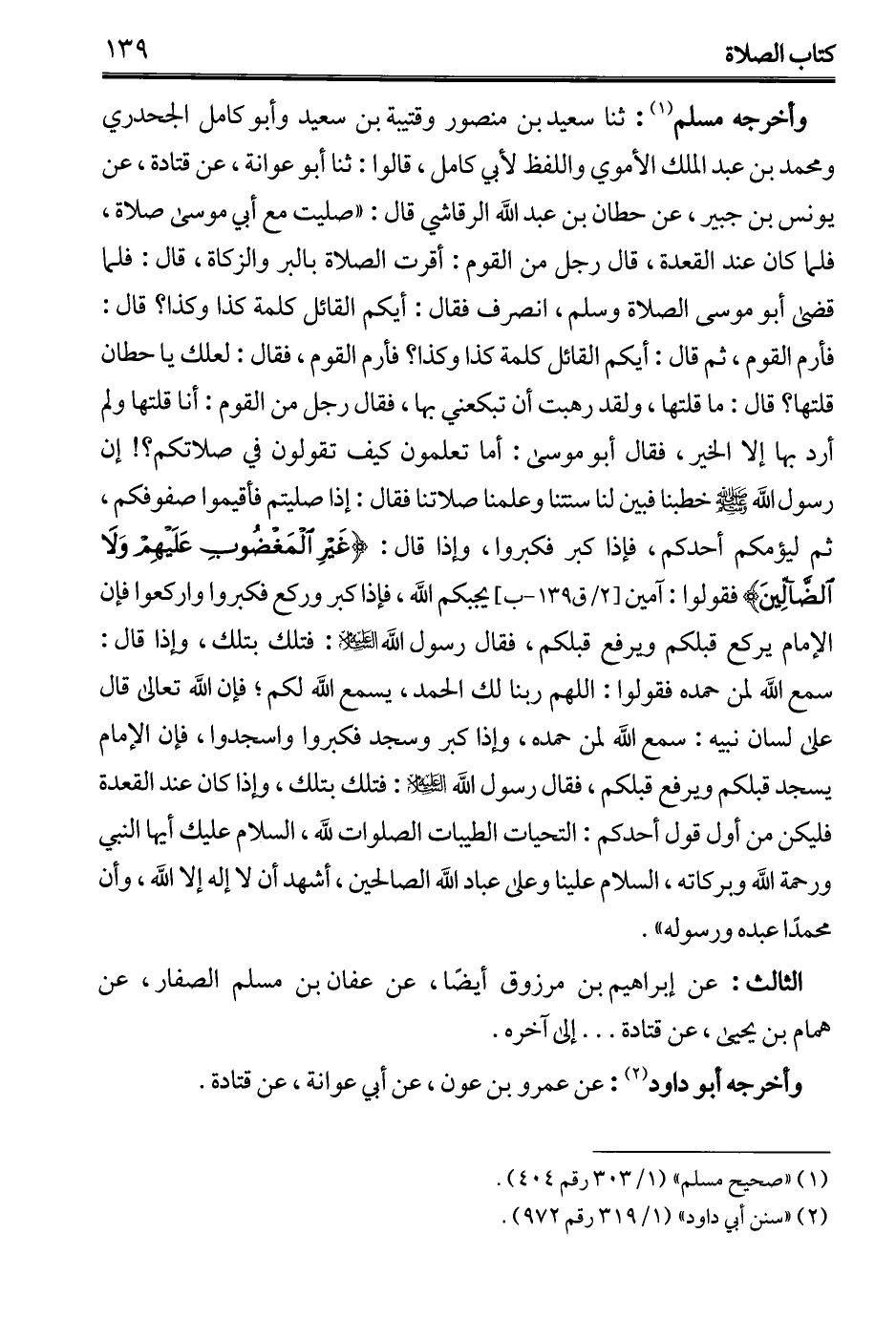 وأخرجه مسلم (¬1): ثنا سعيد بن منصور وقتيبة بن سعيد وأبو كامل الجحدري ومحمد بن عبد الملك الأموي واللفظ لأبي كامل، قالوا: ثنا أبو عوانة، عن قتادة، عن يونس بن جبير، عن حطان بن عبد الله الرقاشي قال: "صليت مع أبي موسى صلاة، فلما كان عند القعدة، قال رجل من القوم: أقرت الصلاة بالبر والزكاة، قال: فلما قضى أبو موسى الصلاة وسلم، انصرف فقال: أيكم القائل كلمة كذا وكذا؟ قال: فأرم القوم، ثم قال: أيكم القائل كلمة كذا وكذا؟ فأرم القوم، فقال: لعلك يا حطان قلتها؟ قال: ما قلتها, ولقد رهبت أن تبكعني بها، فقال رجل من القوم: أنا قلتها ولم أرد بها إلا الخير، فقال أبو موسى: أما تعلمون كيف تقولون في صلاتكم؟! إن رسول الله - صلى الله عليه وسلم - خطبنا فبين لنا سنتنا وعلمنا صلاتنا فقال: إذا صليتم فأقيموا صفوفكم، ثم ليؤمكم أحدكم، فإذا كبر فكبروا، إذا قال: {غَيْرِ الْمَغْضُوبِ عَلَيْهِمْ وَلَا الضَّالِّينَ} فقولوا: آمين يجبكم الله، فإذا كبر وركع فكبروا واركعوا فإن الإِمام يركع قبلكم ويرفع قبلكم، فقال رسول الله - عليه السلام -: فتلك بتلك، وإذا قال: سمع الله لمن حمده فقولوا: اللهم ربنا لك الحمد، يسمع الله لكم؛ فإن الله تعالى قال على لسان نبيه: سمع الله لمن حمده، وإذا كبر وسجد فكبروا واسجدوا، فإن الإِمام يسجد قبلكم ويرفع قبلكم، فقال رسول الله - عليه السلام -: فتلك بتلك، وإذا كان عند القعدة فليكن من أول قول أحدكم: التحيات الطيبات الصلوات لله، السلام عليك أيها النبي ورحمة الله وبركاته، السلام علينا وعلى عباد الله الصالحين، أشهد أن لا إله إلا الله، وأن محمدًا عبده ورسوله".