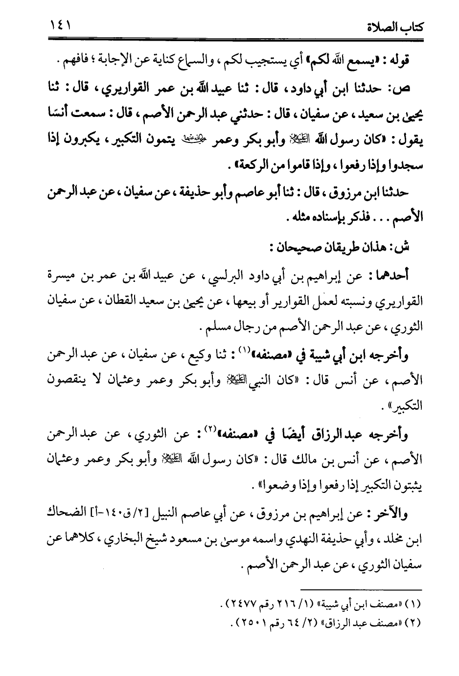 ص: حدثنا ابن أبي داود، قال: ثنا عبيد الله بن عمر القواريري، قال: ثنا يحيى بن سعيد، عن سفيان، قال: حدثني عبد الرحمن الأصم، قال: سمعت أنسًا يقول: "كان رسول الله - عليه السلام - وأبو بكر وعمر - رضي الله عنهما - يتمون التكبير، يكبرون إذا سجدوا إذا رفعوا، وإذا قاموا من الركعة".