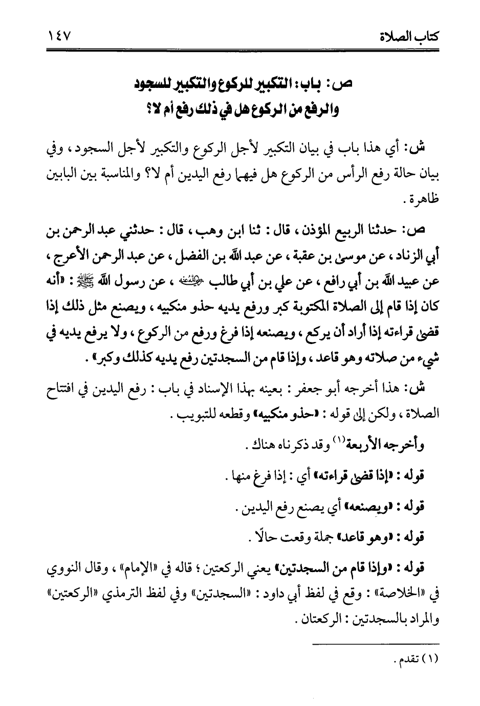 ص: حدثنا الربيع المؤذن، قال: ثنا ابن وهب، قال: حدثني عبد الرحمن بن أبي الزناد، عن موسى بن عقبة، عن عبد الله بن الفضل، عن عبد الرحمن الأعرج، عن عبيد الله بن أبي رافع، عن علي بن أبي طالب - رضي الله عنه -، عن رسول الله - صلى الله عليه وسلم -: "أنه كان إذا قام إلى الصلاة المكتوبة كبر ورفع يديه حذو منكبيه، ويصنع مثل ذلك إذا قضى قراءته إذا أراد أن يركع، ويصنعه إذا فرغ ورفع من الركوع، ولا يرفع يديه في شيء من صلاته وهو قاعد، وإذا قام من السجدتين رفع يديه كذلك وكبر".