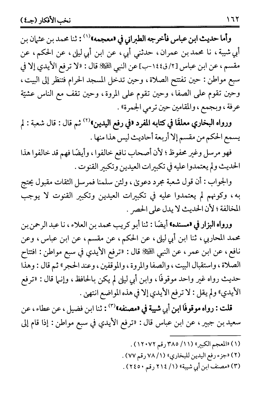 والجواب: أن قول شعبة مجرد دعوى، ولئن سلمنا فمرسل الثقات مقبول يحتج به، وكونهم لم يعتمدوا عليه في تكبيرات العيدين وتكبير القنوت لا يوجب المخالفة؛ لأن الحديث لا يدل على الحصر.