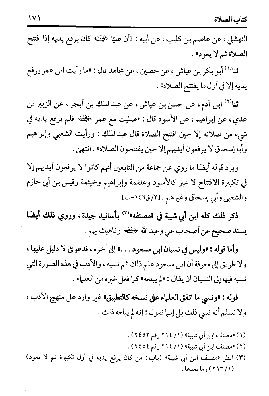(¬3) انظر "مصنف ابن أبي شيبة" (باب: من كان يرفع يديه في أول تكبيرة ثم لا يعود) (1/ 213) وما بعدها.