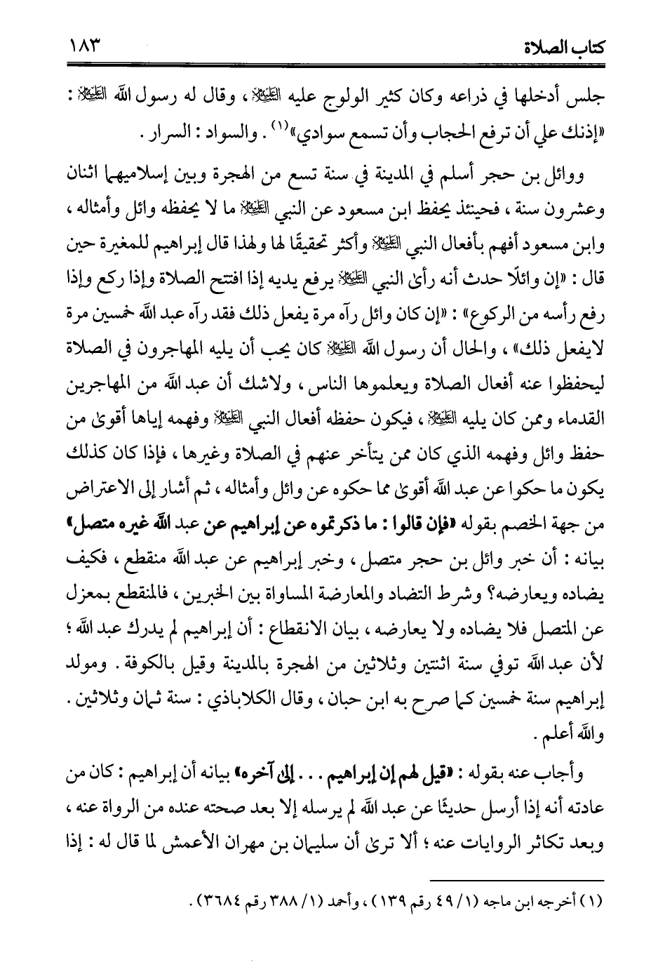 ووائل بن حجر أسلم في المدينة في. سنة تسع من الهجرة وبين إسلاميهما اثنان وعشرون سنة، فحينئذ يحفظ ابن مسعود عن النبي - عليه السلام - ما لا يحفظه وائل وأمثاله، وابن مسعود أفهم بأفعال النبي - عليه السلام - وأكثر تحقيقًا لها ولهذا قال إبراهيم للمغيرة حين قال: "إن وائلًا حدث أنه رأى النبي - عليه السلام - يرفع يديه إذا افتتح الصلاة وإذا ركع وإذا رفع رأسه من الركوع": "إن كان وائل رآه مرة يفعل ذلك فقد رآه عبد الله خمسين مرة لا يفعل ذلك"، والحال أن رسول الله - عليه السلام - كان يحب أن يليه المهاجرون في الصلاة ليحفظوا عنه أفعال الصلاة ويعلموها الناس، ولا شك أن عبد الله من المهاجرين القدماء وممن كان يليه - عليه السلام -، فيكون حفظه أفعال النبي - عليه السلام - وفهمه إياها أقوى من حفظ وائل وفهمه الذي كان ممن يتأخر عنهم في الصلاة وغيرها، فإذا كان كذلك يكون ما حكوا عن عبد الله أقوى مما حكوه عن وائل وأمثاله، ثم أشار إلى الاعتراض من جهة الخصم بقوله "فإن قالوا: ما ذكرتموه عن إبراهيم عن عبد الله غيره متصل" بيانه: أن خبر وائل بن حجر متصل، وخبر إبراهيم عن عبد الله منقطع، فكيف يضاده ويعارضه؟ وشرط التضاد والمعارضة المساواة بين الخبرين، فالمنقطع بمعزل عن المتصل فلا يضاده ولا يعارضه، بيان الانقطاع: أن إبراهيم لم يدرك عبد الله؛ لأن عبد الله توفي سنة اثنتين وثلاثين من الهجرة بالمدينة وقيل بالكوفة. ومولد إبراهيم سنة خمسين كما صرح به ابن حبان، وقال الكلاباذي: سنة ثمان وثلاثين. والله أعلم.