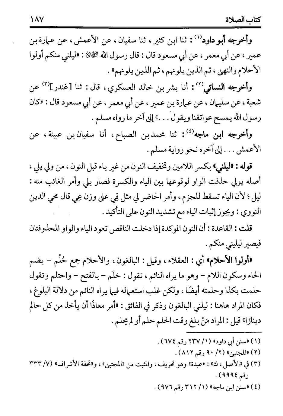وأخرجه أبو داود (¬1): ثنا ابن كثير، ثنا سفيان، عن الأعمش، عن عمارة بن عمير، عن أبي معمر، عن أبي مسعود قال: قال رسول الله - عليه السلام -: "ليلني منكم أولوا الأحلام والنهى، ثم الذين يلونهم، ثم الذين يلونهم".