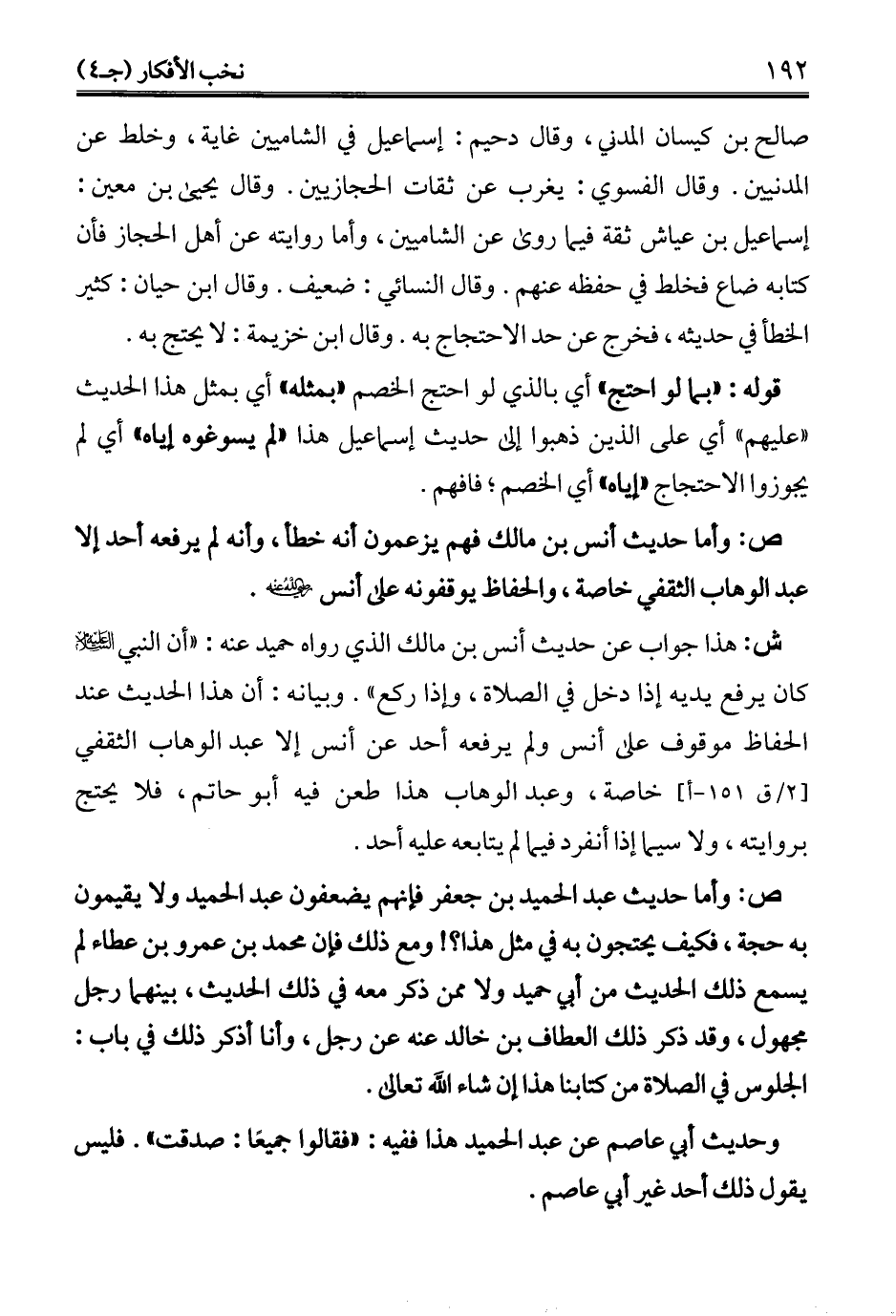 ش: هذا جواب عن حديث أنس بن مالك الذي رواه حميد عنه: "أن النبي - عليه السلام - كان يرفع يديه إذا دخل في الصلاة، وإذا ركع". وبيانه: أن هذا الحديث عند الحفاظ موقوف على أنس ولم يرفعه أحد عن أنس إلا عبد الوهاب الثقفي خاصة، وعبد الوهاب هذا طعن فيه أبو حاتم، فلا يحتج بروايته، ولا سيما إذا أنفرد فيما لم يتابعه عليه أحد.