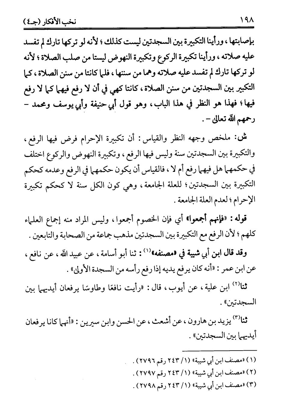 بإصابتها، ورأينا التكبيرة بين السجدتين ليست كذلك؛ لأنه لو تركها تارك لم تفسد عليه صلاته، ورأينا تكبيرة الركوع وتكبيرة النهوض ليستا من صلب الصلاة؛ لأنه لو تركها تارك لم تفسد عليه صلاته وهما من سننها، فلما كانتا من سنن الصلاة، كما التكبير بين السجدتين من سنن الصلاة، كانتا كهي في أن لا رفع فيهما كما لا رفع فيها؛ فهذا هو النظر في هذا الباب، وهو قول أبي حنيفة وأبي يوسف ومحمد -رحمهم الله تعالى-.