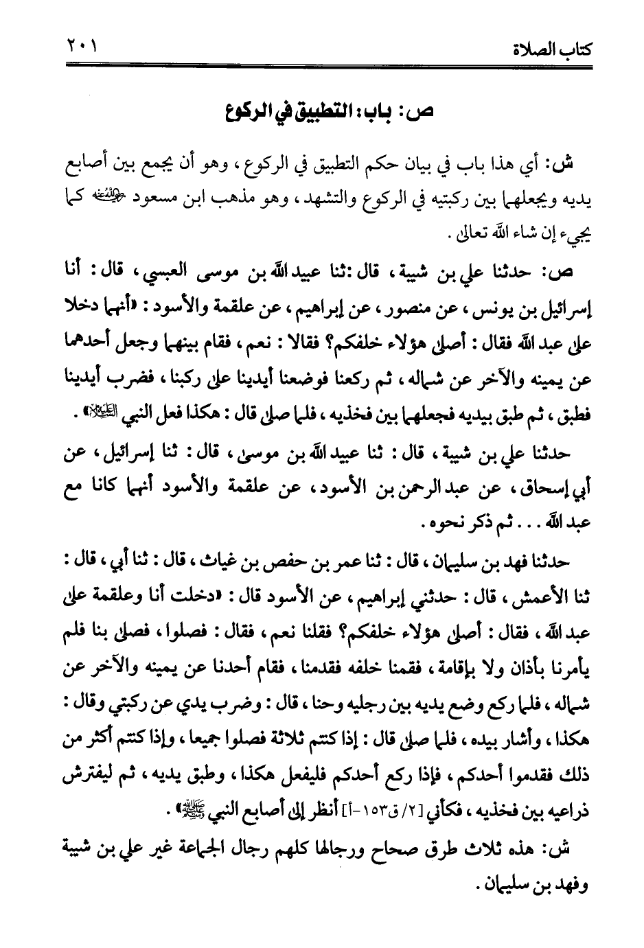 ص: حدثنا علي بن شيبة، قال: ثنا عبيد الله بن موسى العبسي، قال: أنا إسرائيل بن يونس، عن منصور، عن إبراهيم، عن علقمة والأسود: "أنهما دخلا على عبد الله فقال: أصلى هؤلاء خلفكم؟ فقالا: نعم، فقام بينهما وجعل أحدهما عن يمينه والآخر عن شماله، ثم ركعنا فوضعنا أيدينا على ركبنا، فضرب أيدينا فطبق، ثم طبق بيديه فجعلهما بين فخديه، فلما صلى قال: هكذا فعل النبي - عليه السلام -".