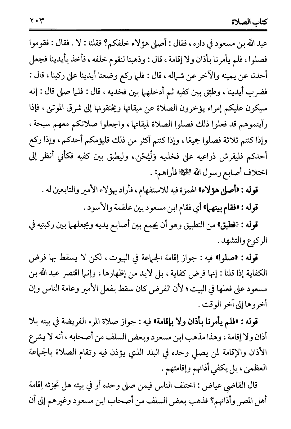 عبد الله بن مسعود في داره، فقال: أصلى هؤلاء خلفكم؟ فقلنا: لا. فقال: فقدموا فصلوا، فلم يأمرنا بأذان ولا إقامة، قال: وذهبنا لنقوم خلفه، فأخذ بأيدينا فجعل أحدنا عن يمينه والآخر عن شماله، قال: فلما ركع وضعنا أيدينا على ركبنا، قال: فضرب أيدينا، وطبّق بين كفيه ثم أدخلهما بين فخديه، قال: فلما صلى قال: إنه سيكون عليكم إمراء يؤخرون الصلاة عن ميقاتها ويخنقونها إلى شرق الموتى، فإذا رأيتموهم قد فعلوا ذلك فصلوا الصلاة لميقاتها، واجعلوا صلاتكم معهم سبحة، وإذا كنتم ثلاثة فصلوا جميعًا، وإذا كنتم أكثر من ذلك فليؤمكم أحدكم، وإذا ركع أحدكم فليفرش ذراعيه على فخذيه وَلْيُحْن، وليطبق بين كفيه فكأني أنظر إلى اختلاف أصابع رسول الله - عليه السلام - فأراهم".