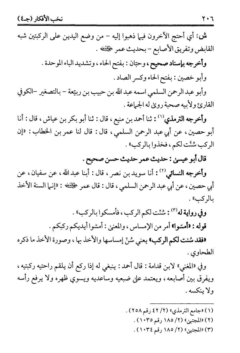 وأحْرجه النسائي (¬2): أنا سويد بن نصر، قال: أبنا عبد الله، عن سفيان، عن أبي حصين، عن أبي عبد الرحمن السلمي، قال: قال عمر - رضي الله عنه -: "إنما السنة الأخذ بالركب".