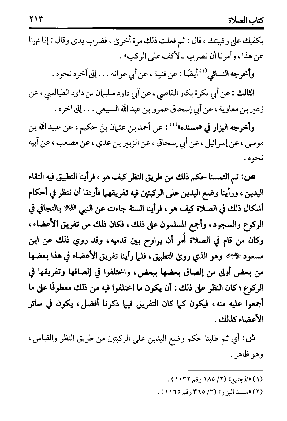 ص: ثم التمسنا حكم ذلك من طريق النظر كيف هو، فرأينا التطبيق فيه التقاء اليدين، ورأينا وضع اليدين على الركبتين فيه تفريقهما فأردنا أن ننظر في أحكام أشكال ذلك في الصلاة كيف هو، فرأينا السنة جاءت عن النبي - عليه السلام - بالتجافي في الركوع والسجود، وأجمع المسلمون على ذلك، فكان ذلك من تفريق الأعضاء، وكان من قام في الصلاة أُمر أن يراوح بين قدميه، وقد روي ذلك عن ابن مسعود - رضي الله عنه - وهو الذي روى التطبيق، فلما رأينا تفريق الأعضاء في هذا بعضها من بعض أولى من إلصاق بعضها ببعض، واختلفوا في إلصاقها وتفريقها في الركوع؛ كان النظر على ذلك: أن يكون ما اختلفوا فيه من ذلك معطوفًا على ما أجمعوا عليه منه، فيكون كما كان التفريق فيما ذكرنا أفضل، يكون في سائر الأعضاء كذلك.