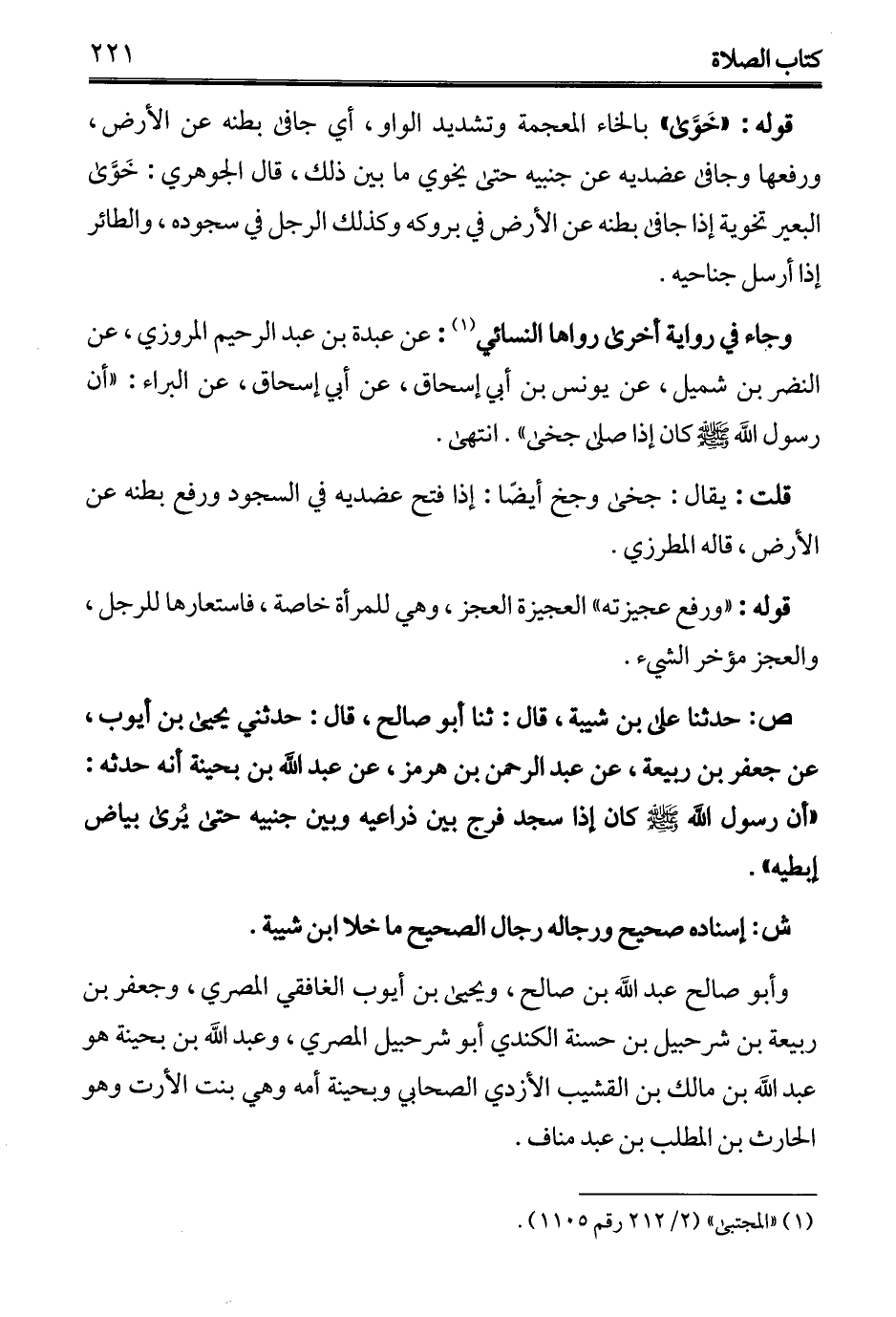 ص: حدثنا على بن شيبة، قال: ثنا أبو صالح، قال: حدثني يحيى بن أيوب، عن جعفر بن ربيعة، عن عبد الرحمن بن هرمز، عن عبد الله بن بحينة أنه حدثه: "أن رسول الله - صلى الله عليه وسلم - كان إذا سجد فرج بين ذراعيه وبين جنبيه حتى يُرى بياض إبطيه".