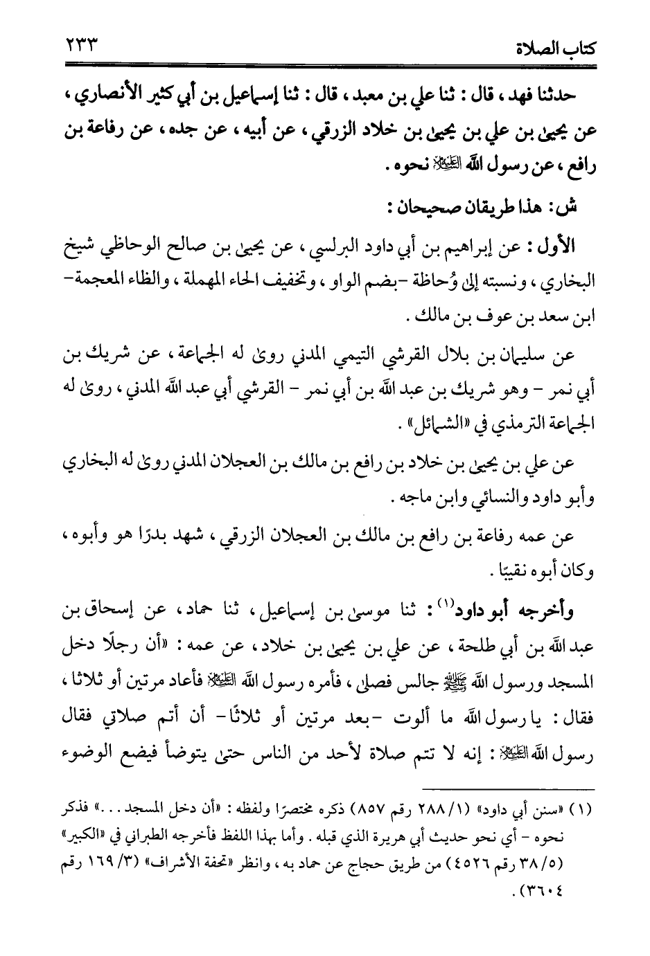 حدثنا فهد، قال: ثنا علي بن معبد، قال: ثنا إسماعيل بن أبي كثير الأنصاري، عن يحيى بن علي بن يحيى بن خلاد الزرقي، عن أبيه، عن جده، عن رفاعة بن رافع، عن رسول الله - عليه السلام - نحوه.