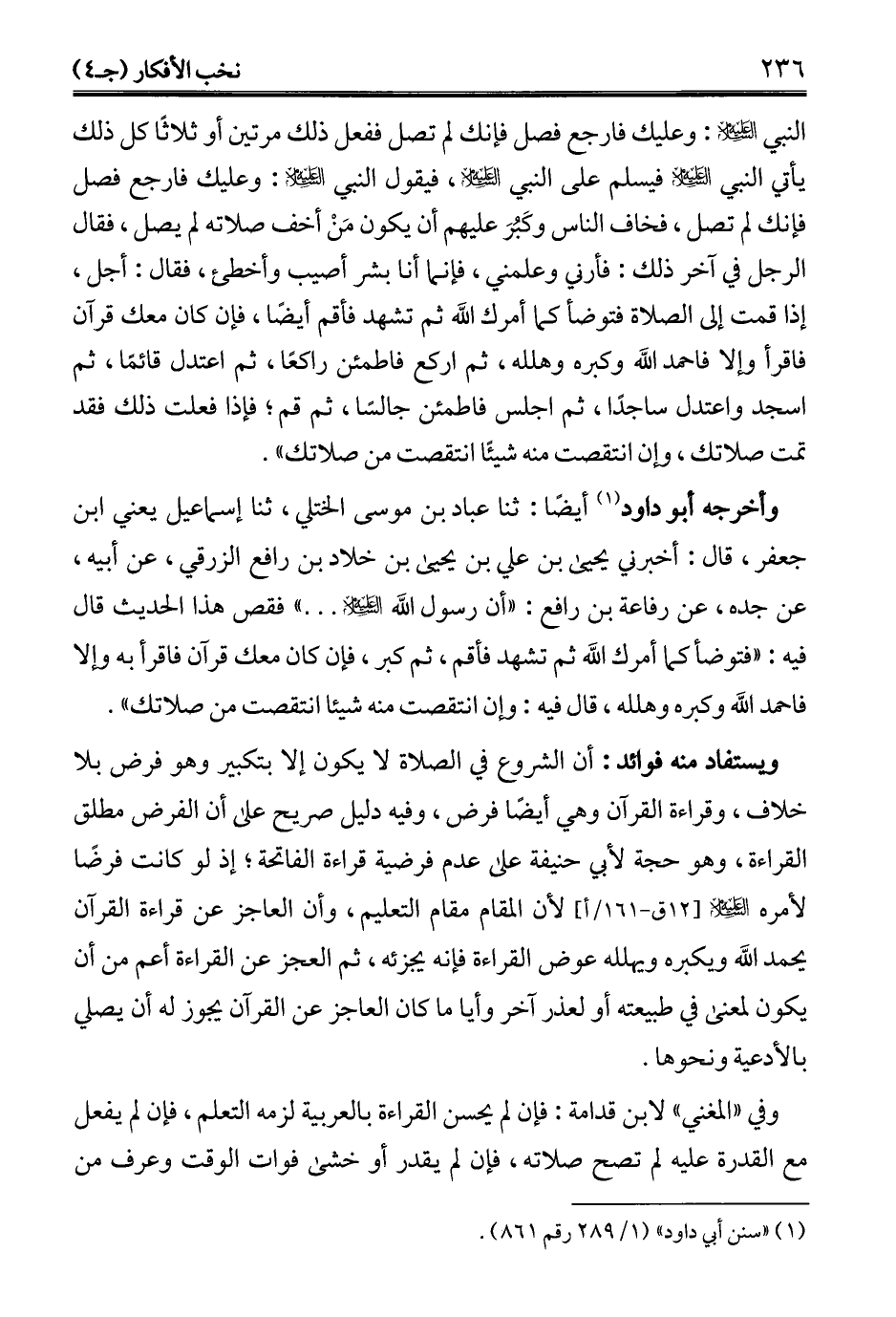 النبي - عليه السلام -: وعليك فارجع فصل فإنك لم تصل ففعل ذلك مرتين أو ثلاثًا كل ذلك يأتي النبي - عليه السلام - فيسلم على النبي - عليه السلام -، فيقول النبي - عليه السلام -: وعليك فارجع فصل فإنك لم تصل، فخاف الناس وكَبُرَ عليهم أن يكون مَنْ أخف صلاته لم يصل، فقال الرجل في آخر ذلك: فأرني وعلمني، فإنما أنا بشر أصيب وأخطئ، فقال: أجل، إذا قمت إلى الصلاة فتوضأ كما أمرك الله ثم تشهد فأقم أيضًا، فإن كان معك قرآن فاقرأ وإلا فاحمد الله وبره وهلله، ثم اركع فاطمئن راكعًا، ثم اعتدل قائمًا، ثم اسجد واعتدل ساجدًا، ثم اجلس فاطمئن جالسًا، ثم قم؛ فإذا فعلت ذلك فقد تمت صلاتك، وإن انتقصت منه شيئًا انتقصت من صلاتك".