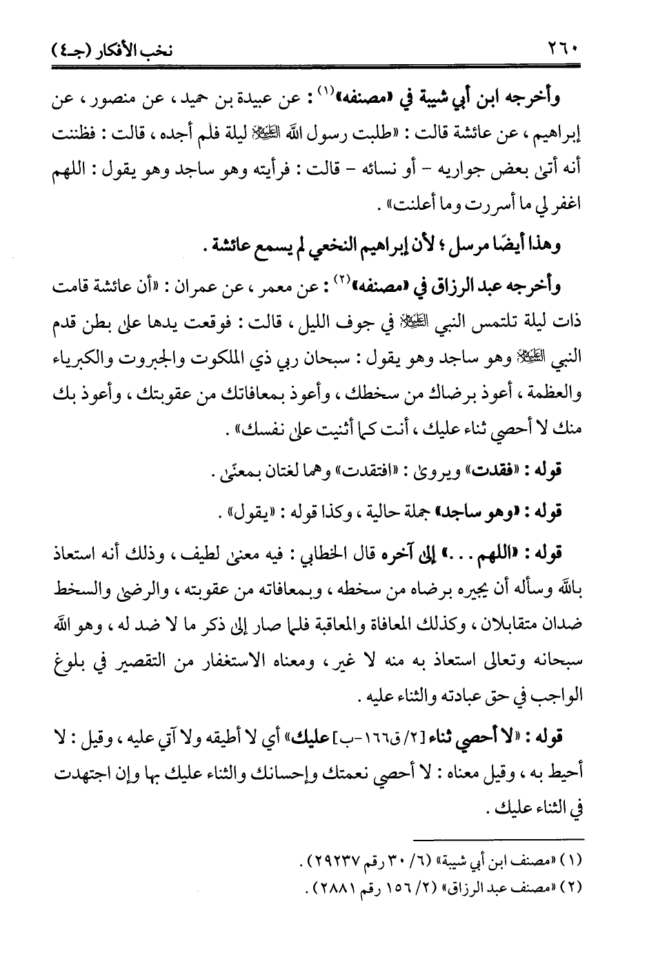 وأخرجه ابن أبي شيبة في "مصنفه" (¬1): عن عبيدة بن حميد، عن منصور، عن إبراهيم، عن عائشة قالت: "طلبت رسول الله - عليه السلام - ليلة فلم أجده، قالت: فظننت أنه أتى بعض جواريه -أو نسائه- قالت: فرأيته وهو ساجد وهو يقول: اللهم اغفر لي ما أسررت وما أعلنت".