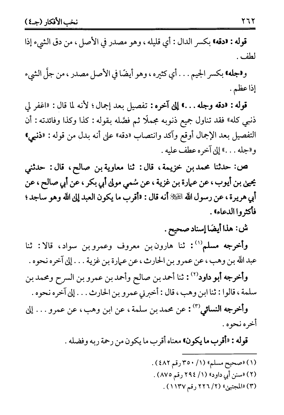 ص: حدثنا محمد بن خزيمة، قال: ثنا معاوية بن صالح، قال: حدثني يحيى بن أيوب، عن عمارة بن غزية، عن سُمي موك أبي بكر، عن أبي صالح، عن أتيت هريرة، عن رسول الله - عليه السلام - أنه قال: "أقرب ما يكون العبد إلى الله وهو ساجد؛ فأكثروا الدعاء".