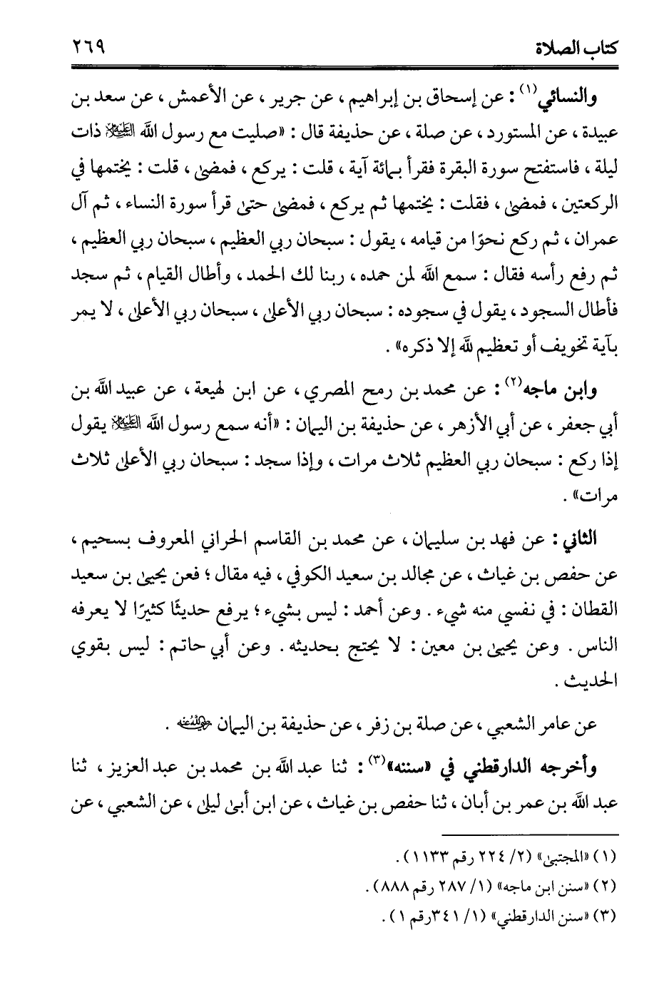 والنسائي (¬1): عن إسحاق بن إبراهيم، عن جرير، عن الأعمش، عن سعد بن عبيدة، عن المستورد، عن صلة، عن حذيفة قال: "صليت مع رسول الله - عليه السلام - ذات ليلة، فاستفتح سورة البقرة فقرأ بمائة آية، قلت: يركع، فمضى، قلت: يختمها في الركعتين، فمضى، فقلت: يختمها ثم يركع، فمضى حتى قرأ سورة النساء، ثم آل عمران، ثم ركع نحوًا من قيامه، يقول: سبحان ربي العظيم، سبحان ربي العظيم، ثم رفع رأسه فقال: سمع الله لمن حمده، ربنا لك الحمد، وأطال القيام، ثم سجد فأطال السجود، يقول في سجوده: سبحان ربي الأعلى، سبحان ربي الأعلى، لا يمر بآية تخويف أو تعظيم لله إلا ذكره".