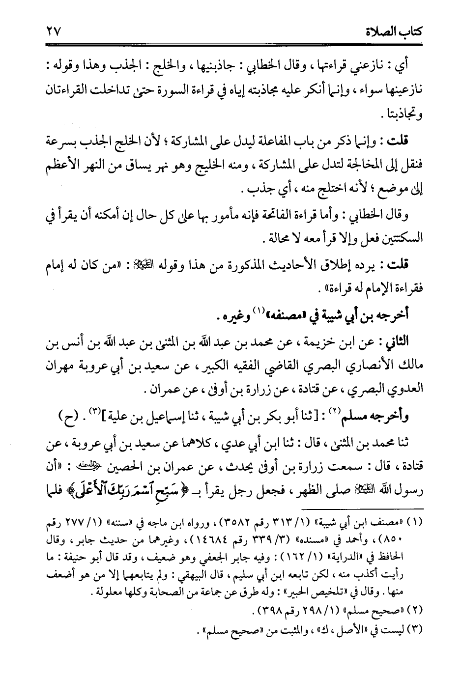 ثنا محمَّد بن المثنى، قال: ثنا ابن أبي عدي، كلاهما عن سعيد بن أبي عروبة، عن قتادة، قال: سمعت زرارة بن أوفى يحدث، عن عمران بن الحصين - رضي الله عنه -: "أن رسول الله - عليه السلام - صلى الظهر، فجعل رجل يقرأ بـ {سَبِّحِ اسْمَ رَبِّكَ الْأَعْلَى} فلما