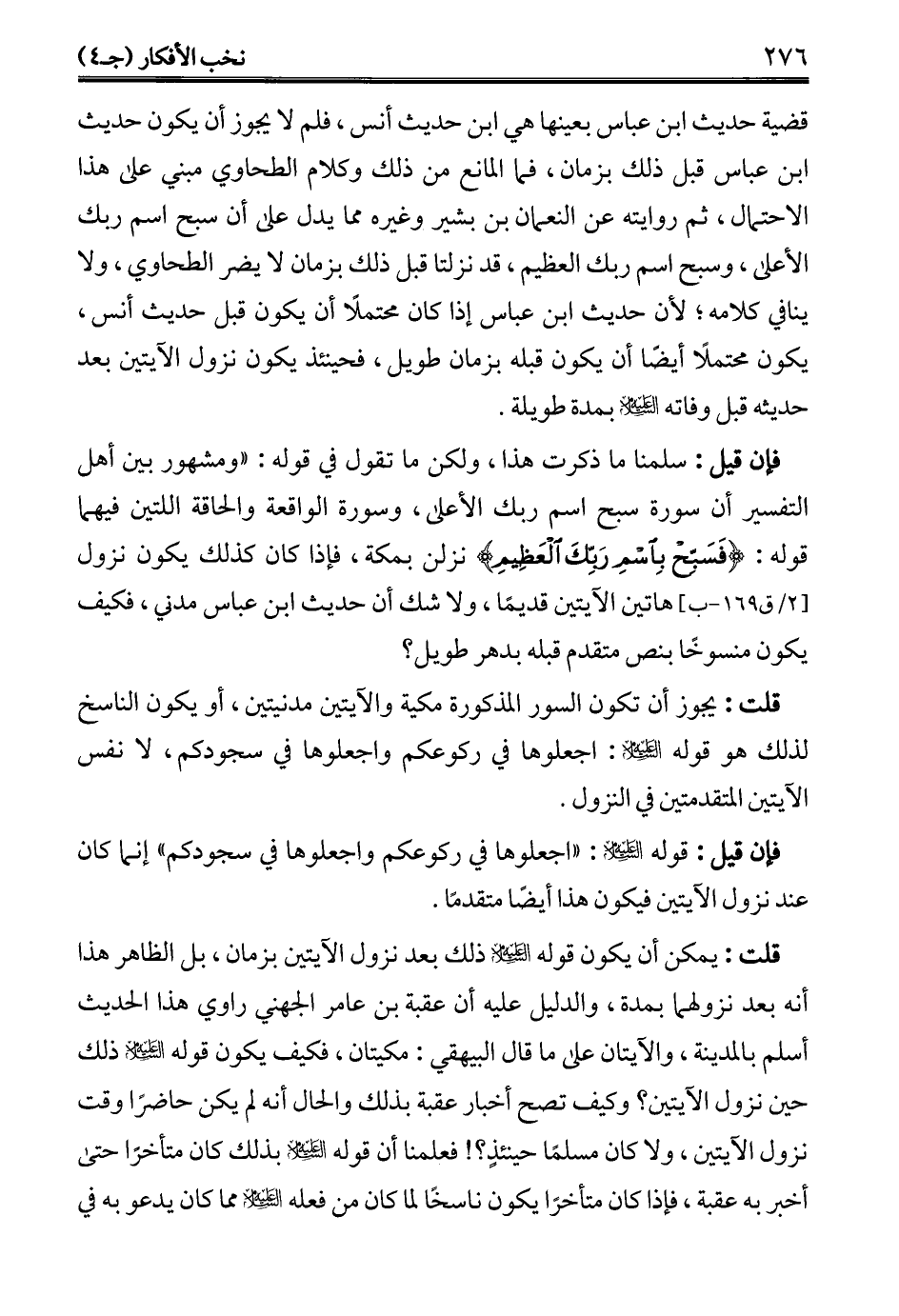 فإن قيل: سلمنا ما ذكرت هذا, ولكن ما تقول في قوله: "ومشهور بين أهل التفسير أن سورة سبح اسم ربك الأعلى، وسورة الواقعة والحاقة اللتين فيهما قوله: {فَسَبِّحْ بِاسْمِ رَبِّكَ الْعَظِيمِ} نزلن بمكة، فإذا كان كذلك يكون نزول هاتين الآيتين قديمًا، ولا شك أن حديث ابن عباس مدني، فكيف يكون منسوخًا بنص متقدم قبله بدهر طويل؟