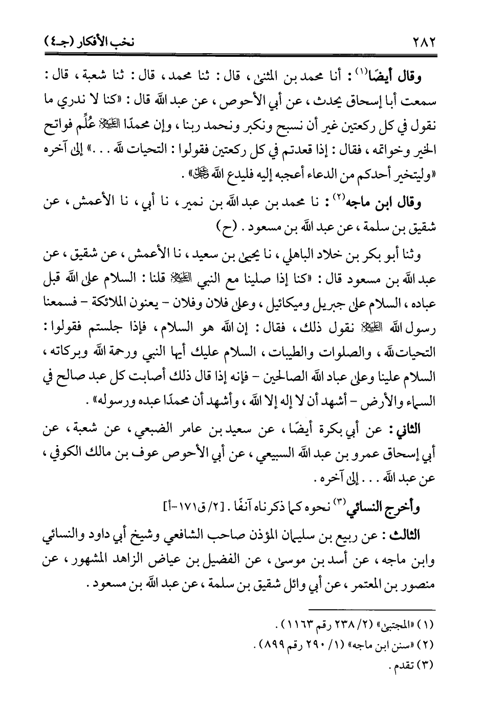 وقال أيضًا (¬1): أنا محمد بن المثنى، قال: ثنا محمَّد، قال: ثنا شعبة، قال: سمعت أبا إسحاق يحدث، عن أبي الأحوص، عن عبد الله قال: "كنا لا ندري ما نقول في كل ركعتين غير أن نسبح ونكبر ونحمد ربنا، وإن محمدًا - عليه السلام - عُلِّم فواتح الخير وخواتمه، فقال: إذا قعدتم في كل ركعتين فقولوا: التحيات لله ... " إلى آخره "وليتخير أحدكم من الدعاء أعجبه إليه فليدع الله -عز وجل-".