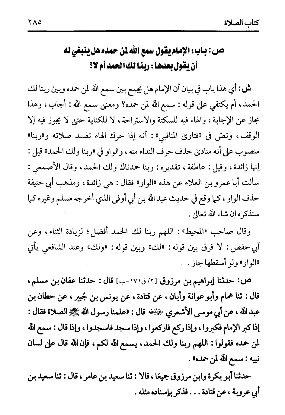 ص: باب: الإمام يقول سمع الله لمن حمده هل ينبغي له أنا يقول بعدها: ربنا لك الحمد أم لا؟
