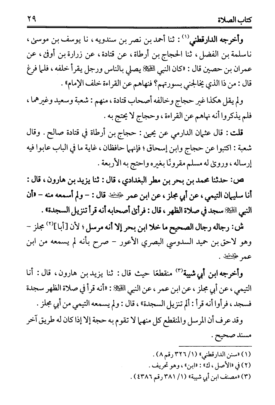 ص: حدثنا محمَّد بن بحر بن مطر البغدادي، قال: ثنا يزيد بن هارون، قال: أنا سليمان التيميم، عن في مجلز، عن ابن عمر - رضي الله عنه - قال: -ولم أسمعه منه- "أن النبي - عليه السلام - سجد في صلاة الظهر، قال: فرأى أصحابه أنه قرأ تنزيل السجدة".