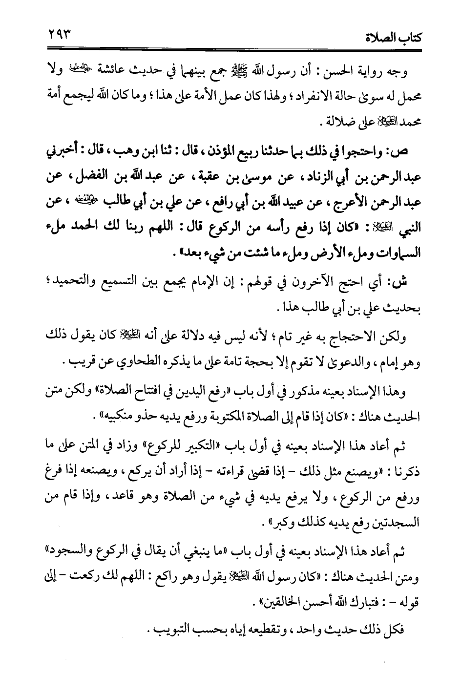 ص: واحتجوا في ذلك بما حدثنا ربيع المؤذن، قال: ثنا ابن وهب، قال: أخبرني عبد الرحمن بن أبي الزناد، عن موسى بن عقبة، عن عبدالله بن الفضل، عن عبد الرحمن الأعرج، عن عبيد الله بن أبي رافع، عن علي بن أبي طالب - رضي الله عنه -، عن النبي - عليه السلام -: "كان إذا رفع رأسه من الركوع قال: اللهم ربنا لك الحمد ملء السماوات وملء الأرض وملء ما شئت من شيء بعد".