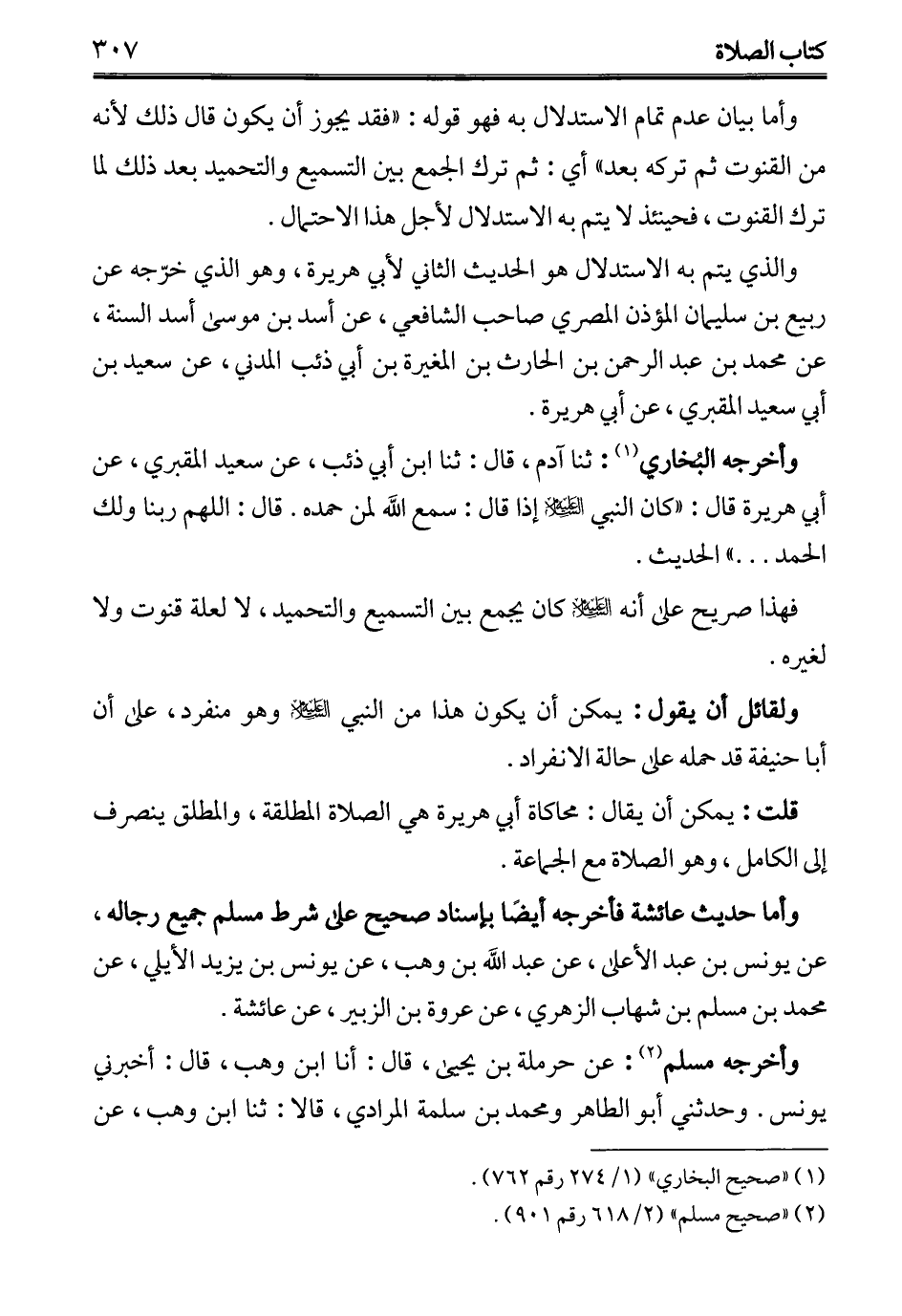 وأما بيان عدم تمام الاستدلال به فهو قوله: "فقد يجوز أن يكون قال ذلك لأنه من القنوت ثم تركه بعد" أي: ثم ترك الجمع بين التسميع والتحميد بعد ذلك لما ترك القنوت، فحينئذ لا يتم به الاستدلال لأجل هذا الاحتمال.