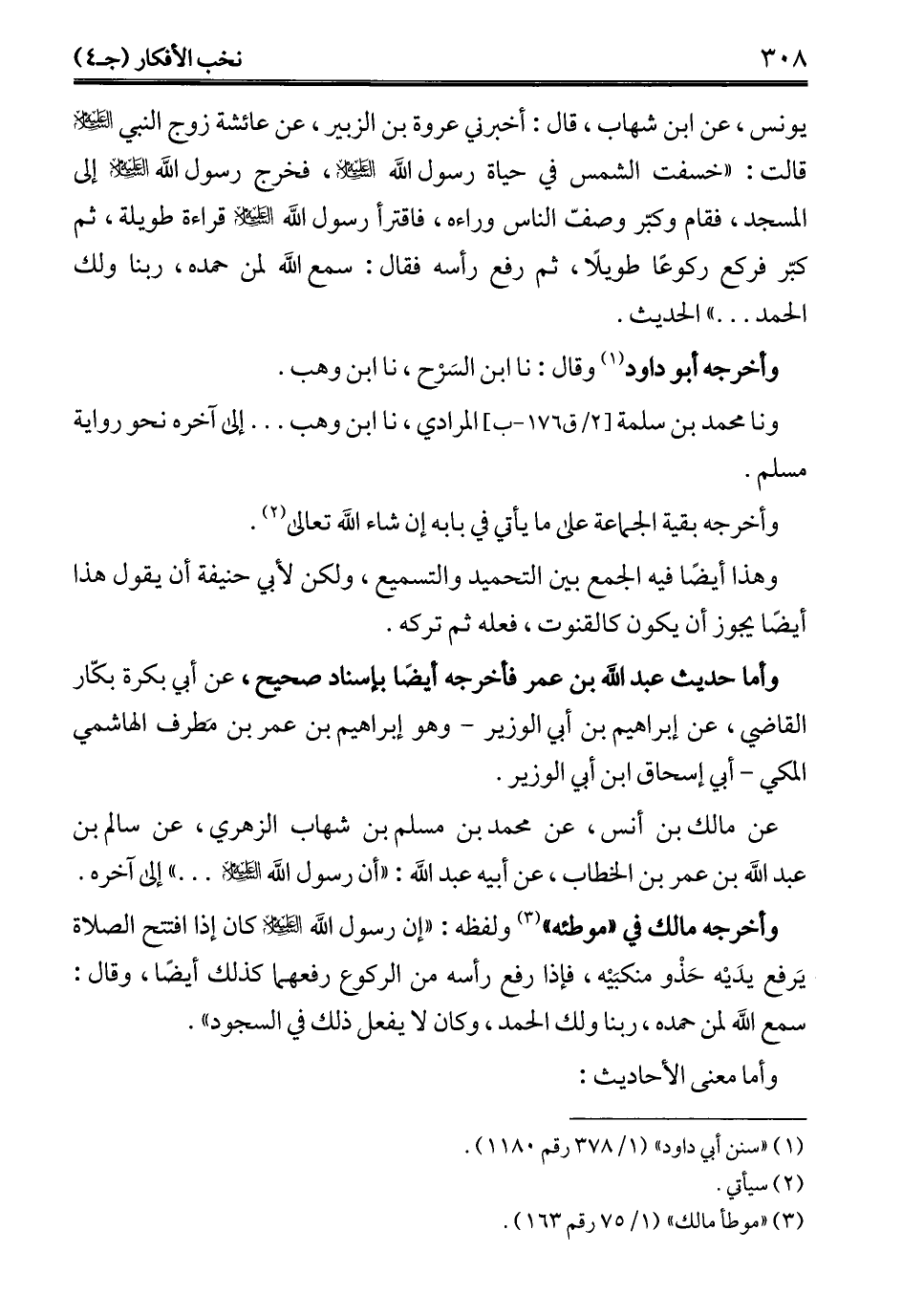 يونس، عن ابن شهاب، قال: أخبرني عروة بن الزبير، عن عائشة زوج النبي - عليه السلام - قالت: "خسفت الشمس في حياة رسول الله - عليه السلام -، فخرج رسول الله - عليه السلام - إلى المسجد، فقام وكبّر وصفّ الناس وراءه، فاقترأ رسول الله - عليه السلام - قراءة طويلة، ثم كبّر فركع ركوعًا طويلًا، ثم رفع رأسه فقال: سمع الله لمن حمده، ربنا ولك الحمد ... " الحديث.