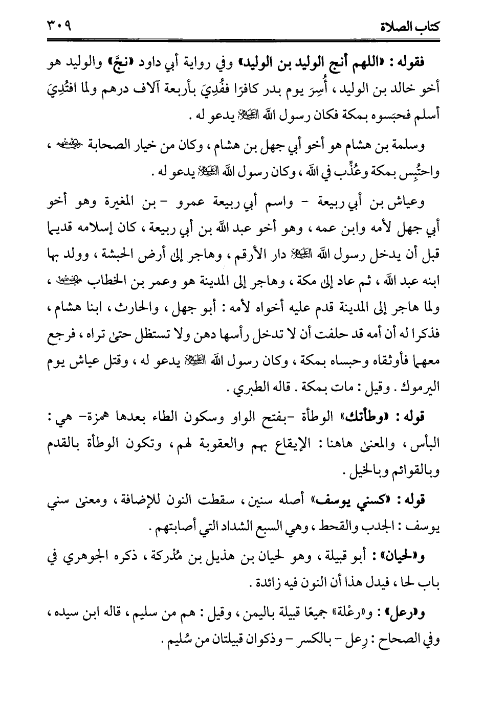 فقوله: "اللهم أنج الوليد بن الوليد" وفي رواية أبي داود "نجَّ" والوليد هو أخو خالد بن الوليد، أُسِرَ يوم بدر كافرًا ففُدِيَ بأربعة آلاف درهم ولما افتُدِيَ أسلم فحبَسوه بمكة فكان رسول الله - عليه السلام - يدعو له.