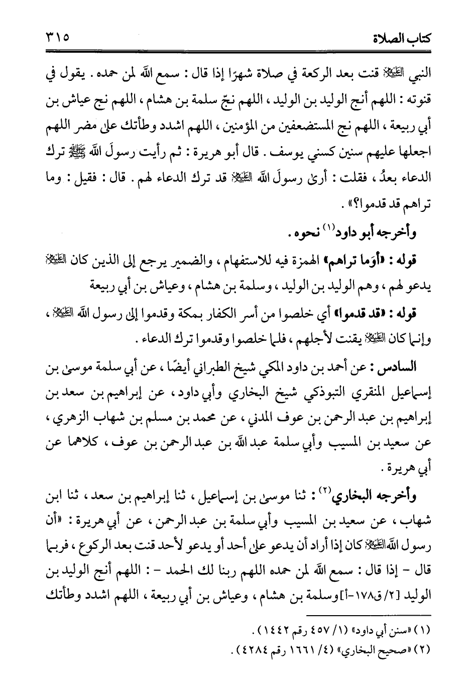 النبي - عليه السلام - قنت بعد الركعة في صلاة شهرًا إذا قال: سمع الله لمن حمده. يقول في قنوته: اللهم أنج الوليد بن الوليد، اللهم نجّ سلمة بن هشام، اللهم نج عياش بن أبي ربيعة، اللهم نج المستضعفين من المؤمنين، اللهم اشدد وطأتك على مضر اللهم اجعلها عليهم سنين كسني يوسف. قال أبو هريرة: ثم رأيت رسول الله - صلى الله عليه وسلم - ترك الدعاء بعدُ، فقلت: أرى رسولَ الله - عليه السلام - قد ترك الدعاء لهم. قال: فقيل: وما تراهم قد قدموا؟ ".