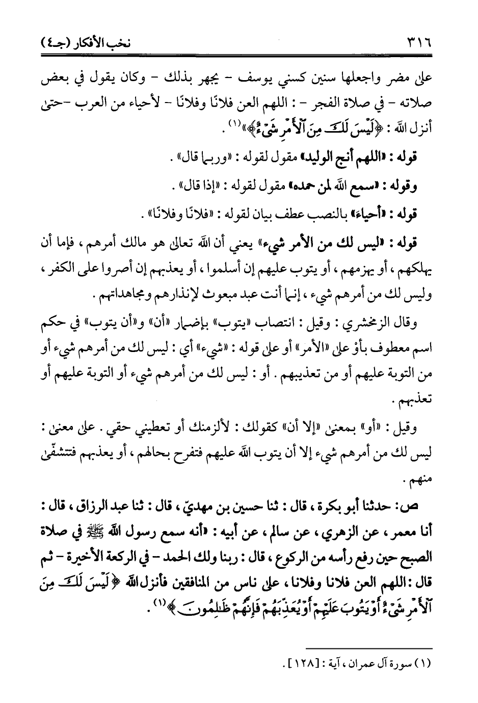 ص: حدثنا أبو بكرة، قال: ثنا حسين بن مهديّ، قال: ثنا عبد الرزاق، قال: أنا معمر، عن الزهري، عن سالم، عن أبيه: "أنه سمع رسول الله - صلى الله عليه وسلم - في صلاة الصبح حين رفع رأسه من الركوع، قال: ربنا ولك الحمد -في الركعة الأخيرة- ثم قال: اللهم العن فلانا وفلانا، على ناس من المنافقين فأنزل الله {لَيْسَ لَكَ مِنَ الْأَمْرِ شَيْءٌ أَوْ يَتُوبَ عَلَيْهِمْ أَوْ يُعَذِّبَهُمْ فَإِنَّهُمْ ظَالِمُونَ} (1).