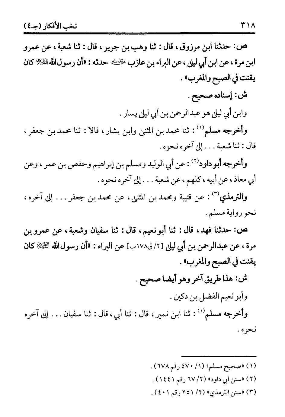 ص: حدثنا فهد، قال: ثنا أبو نعيم، قال: ثنا سفيان وشعبة، عن عمرو بن مرة، عن عبد الرحمن بن أبي ليلى عن البراء: "أن رسول الله - عليه السلام - كان يقنت في الصبح والمغرب".