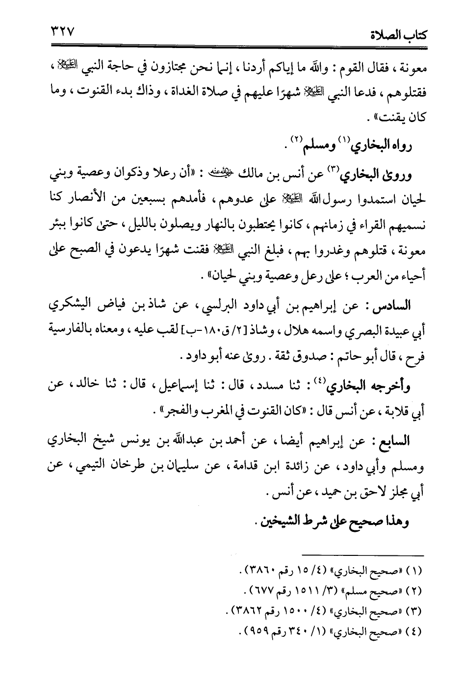 وأخرجه البخاري (¬4): ثنا مسدد، قال: ثنا إسماعيل، قال: ثنا خالد، عن أبي قلابة، عن أنس قال: "كان القنوت في المغرب والفجر".