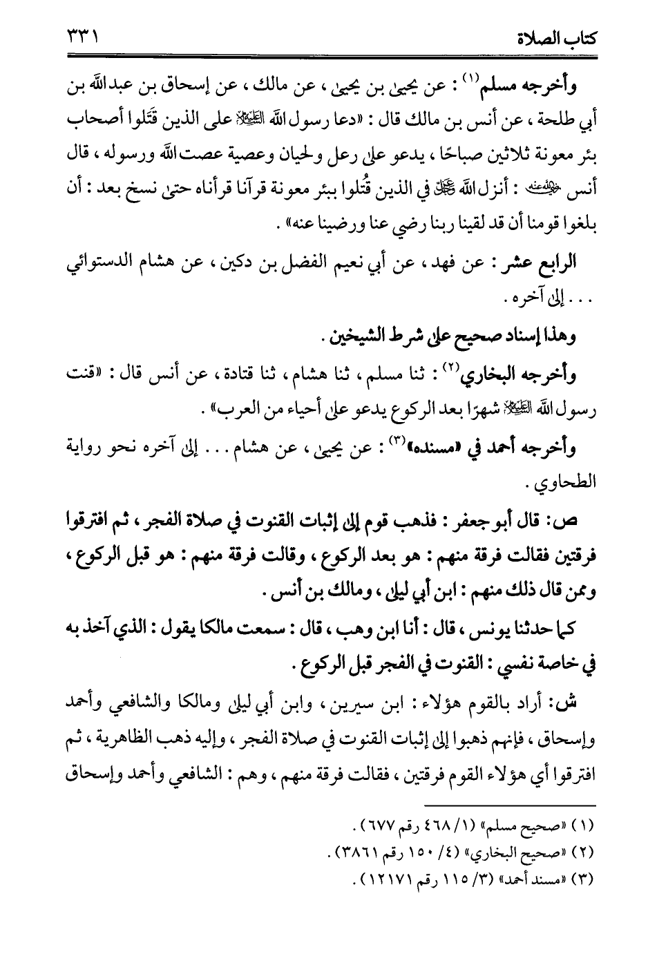 ص: قال أبو جعفر: فذهب قوم إلى إثبات القنوت في صلاة الفجر، ثم افترقوا فرقتين فقالت فرقة منهم: هو بعد الركوع، وقالت فرقة منهم: هو قبل الركوع، وممن قال ذلك منهم: ابن أبي ليلى، ومالك بن أنس.