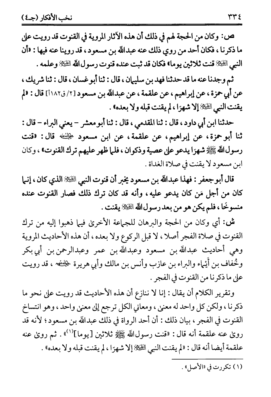 قال أبو جعفر: فهذا عبد الله بن مسعود يخبر أن قنوت النبي - عليه السلام - الذي كان، إنما كان من أجل مَن كان يدعو عليه، وأنه قد كان ترك ذلك فصار القنوت عنده منسوخًا، فلم يكن هو من بعد رسول الله - عليه السلام - يقنت.