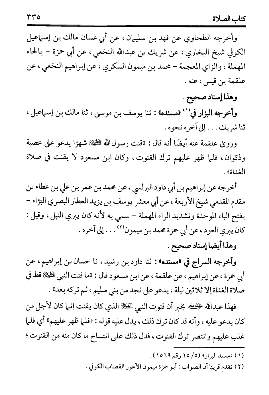 وأخرجه السراج في "مسنده": ثنا داود بن رشيد، نا حسان بن إبراهيم، عن أبي حمزة، عن إبراهيم، عن علقمة، عن ابن مسعود قال: "ما قنت النبي - عليه السلام - قط في صلاة الغداة إلا ثلاثين ليلة، يدعو على نجد من بني سليم، ثم تركه بعد".