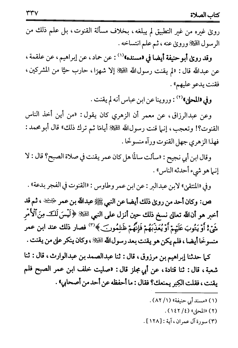 وعن عبد الرزاق، عن معمر أن الزهري كان يقول: "من أين أخذ الناس القنوت؟! وتعجب، إنما قنت رسول الله - عليه السلام - أيامًا ثم ترك ذلك" قال أبو محمَّد: فهذا الزهري جهل القنوت ورآه منسوخًا.