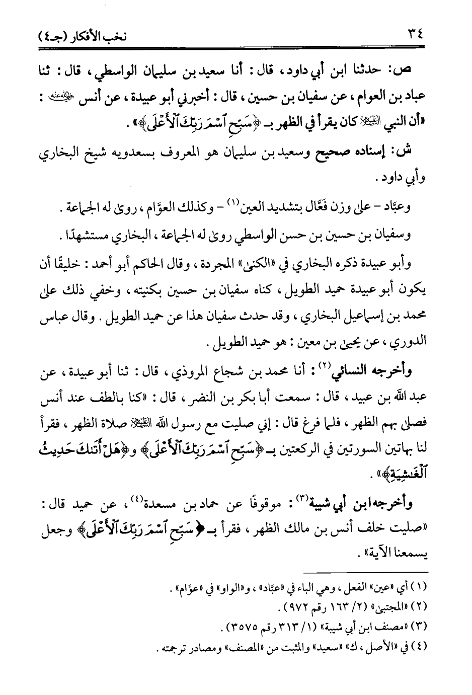 ص: حدثنا ابن أبي داود، قال: أنا سعيد بن سليمان الواسطي، قال: ثنا عباد بن العوام، عن سفيان بن حسين، قال: أخبرني أبو عبيدة، عن أنس - رضي الله عنه -: "أن النبي - عليه السلام - كان يقرأ في الظهر بـ {سَبِّحِ اسْمَ رَبِّكَ الْأَعْلَى} ".