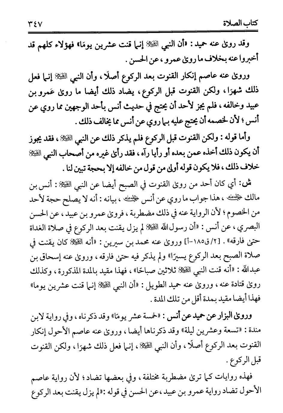 وروى عنه عاصم إنكار القنوت بعد الركوع أصلًا، وأن النبي - عليه السلام - إنما فعل ذلك شهرًا, ولكن القنوت قبل الركوع، يضاد ذلك أيضًا ما روى عَمرو بن عبيد وخالفه، فلم يجز لأحد أن يحتج في حديث أنس بأحد الوجهين مما روي عن أنس؛ لأن لخصمه أن يحتج عليه بما روي عن أنس مما يخالف ذلك.