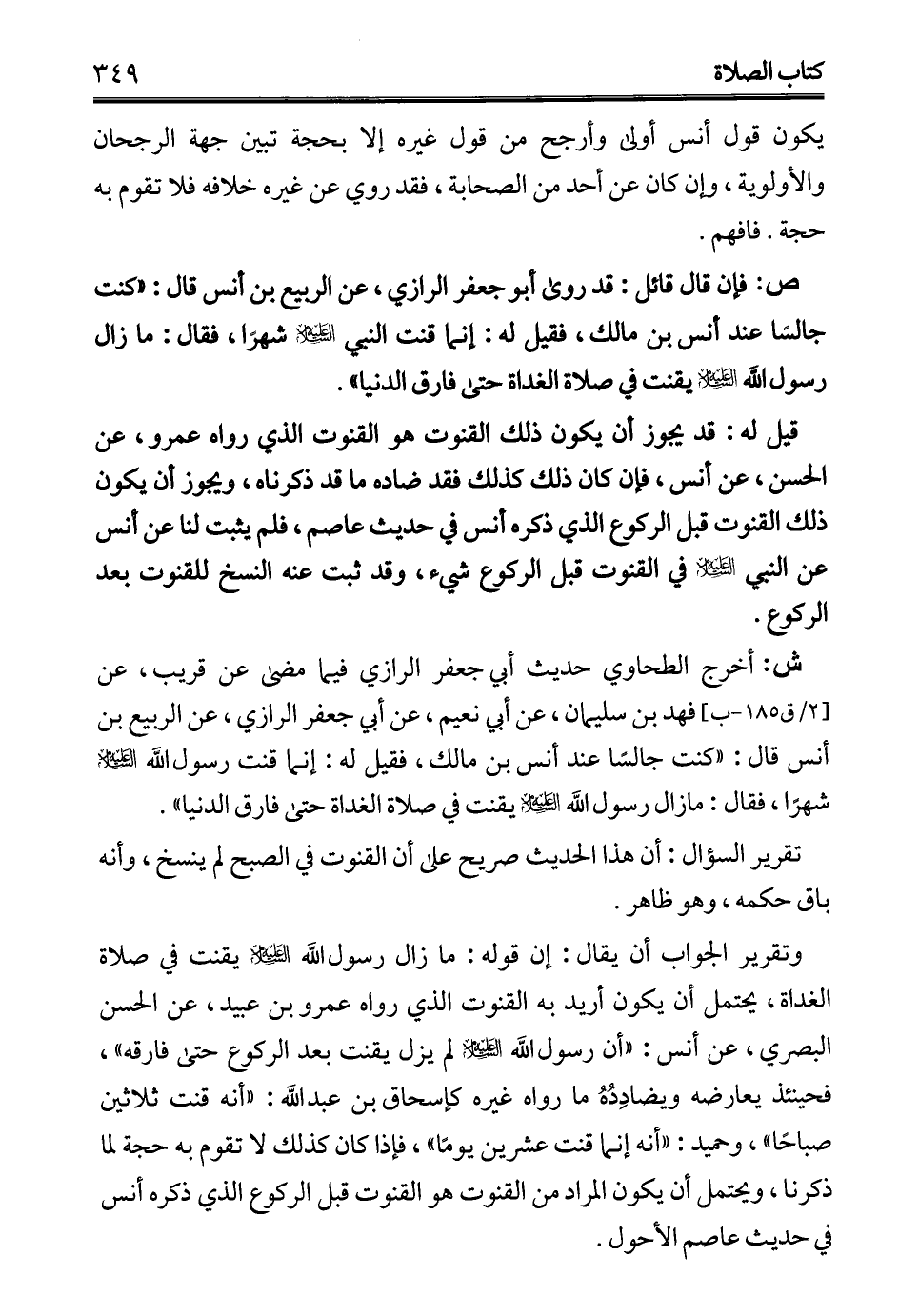 ش: أخرج الطحاوي حديث أبي جعفر الرازي فيما مضى عن قريب، عن فهد بن سليمان، عن أبي نعيم، عن أبي جعفر الرازي، عن الربيع بن أنس قال: "كنت جالسًا عند أنس بن مالك، فقيل له: إنما قنت رسول الله - عليه السلام - شهرًا، فقال: مازال رسول الله - عليه السلام - يقنت في صلاة الغداة حتى فارق الدنيا".